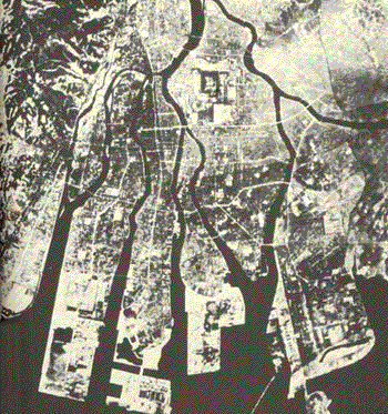 一面、焼け野原となった広島写真の中央にあるのが、原爆(げんばく)投下の目標となったT字がたの相生橋。橋の上側の、川に囲まれた地いきが中島地区(げんざいの平和記念公園)