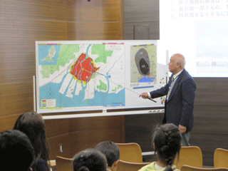 そのために、なぜ広島に原爆が落とされたのかということや、原爆の熱線、爆風、放射線による被害の実相の話をしてから、新井さんの体験を話しています。