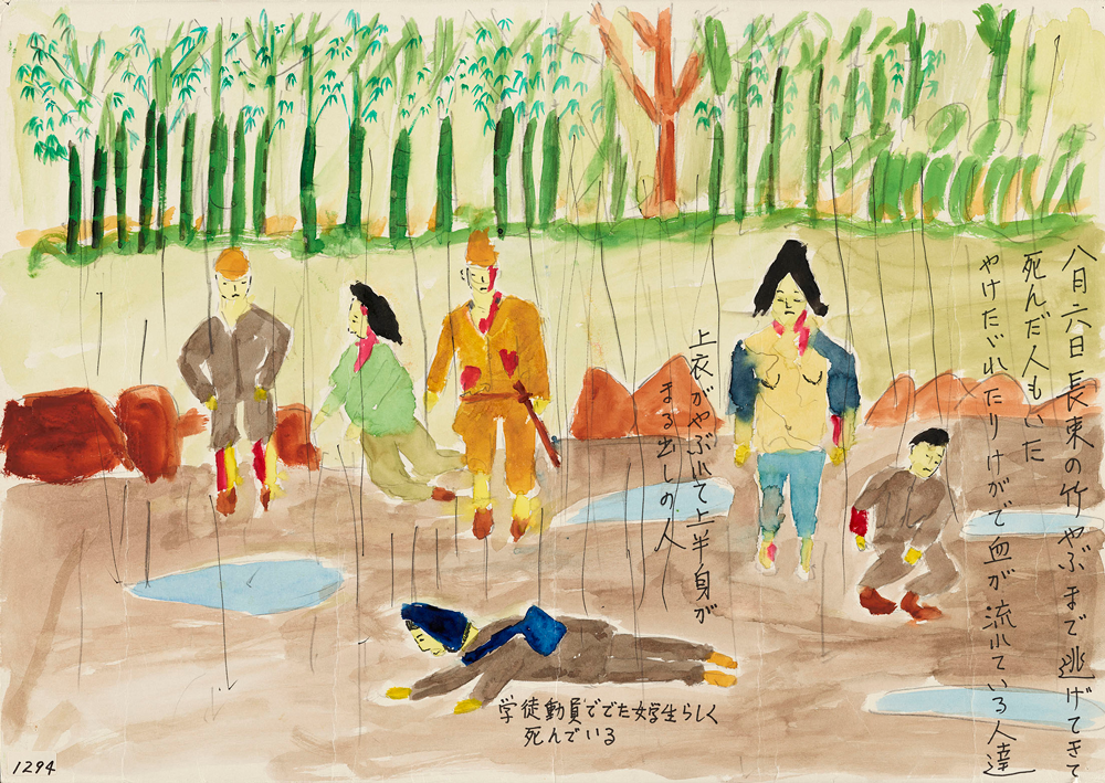 竹やぶを背景に、上半身裸の負傷した女性や、女学生らしき人物の遺体、他にも血まみれの人物が描かれ、黒い雨が表現されています。