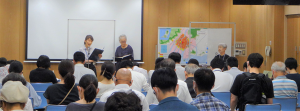 朗読会では、原爆被害の実相を映像で紹介した後、被爆体験記朗読ボランティアが被爆体験記・原爆詩の朗読を行い、続いて参加者自らが原爆詩を朗読します。