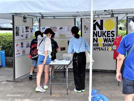 また、会場外でも様々なピースアクティビティが行われ、本財団は、被爆の実相を若い世代に向けて分かりやすく解説した「ヒロシマを知ろう!! 8月6日、きのこ雲の下で」のポスター展示や平和学習資料の配布を行うとともに、場外ステージで行われた被爆ピアノコンサートの実施に協力しました。
